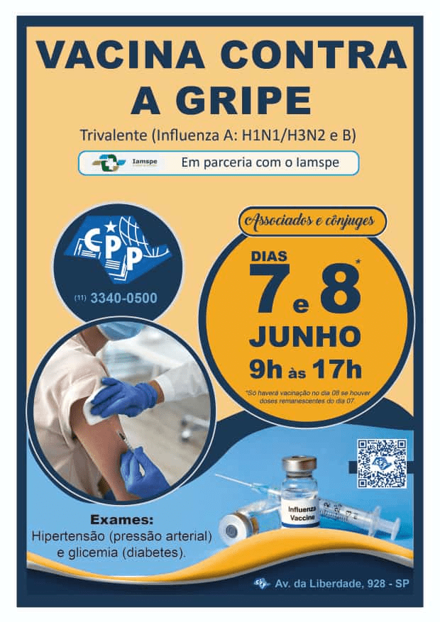 Nos dias 7 e 8 de junho, terça e quarta-feira, os associados do Centro do Professorado Paulista contarão com a aplicação da vacina contra a gripe (Trivalente – Influenza A: H1N1 / H3 N2 e B2), na Sede Central da entidade. Serão disponibilizadas 700 doses.