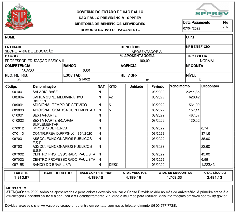 A cópia do holerite, conforme exemplo abaixo, deve ser encaminhada ao e-mail: portal@cpp.org.br.