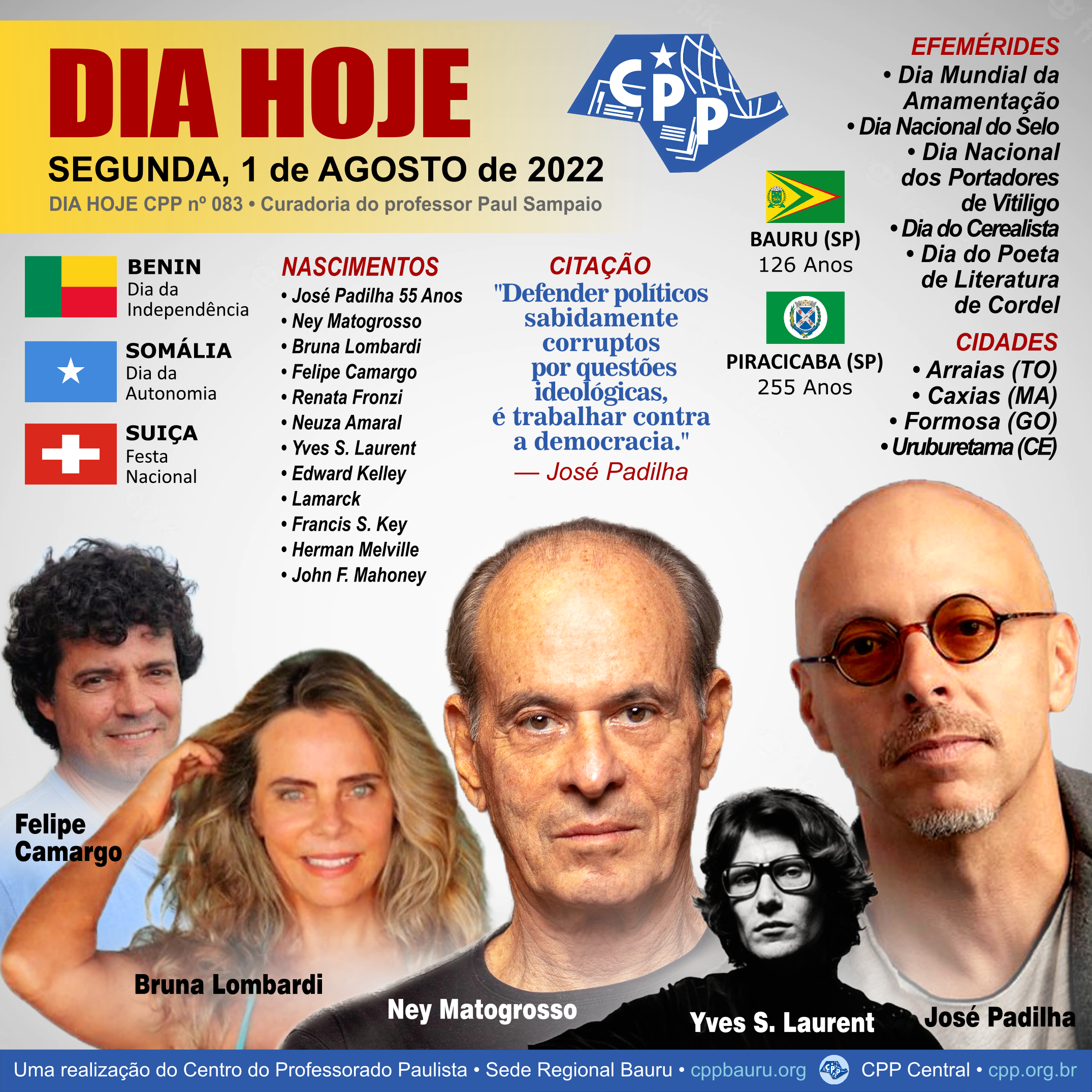 Dia Mundial da Amamentação ♦ CIDADES • Bauru (SP) 126 Anos • Piracicaba (SP) 255 Anos ♥ Aniversário de José Padilha 55 Anos • Edward Kelley • Jean-Baptiste de Lamarck • Francis S. Key • Herman Melville • John Friend Mahoney • Renata Fronzi • Neuza Amaral • Dom DeLuise • Yves S. Laurent • Ney Matogrosso • Bruna Lombardi • Felipe Camargo • Sam Mendes • Sérgio Moro ♣ ÓBITOS • Orlando Orfei