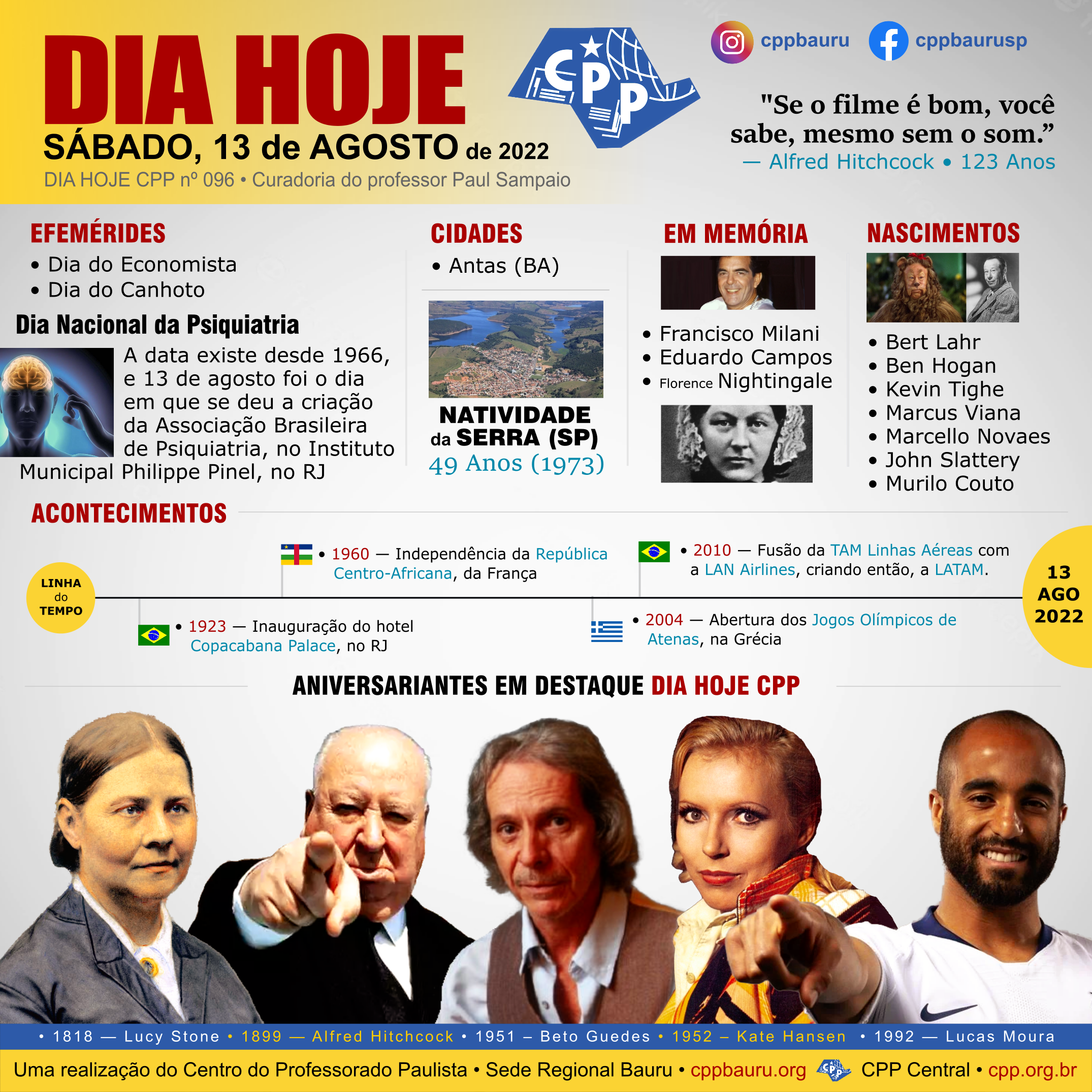 CIDADE • Natividade da Serra (SP) 49 Anos ♦ CAPA • Alfred Hitchcock 123 Anos ♥ NASCIMENTOS • Giovanni Agnelli • Bert Lahr • Ben Hogan • Kevin Tighe • Beto Guedes • Kate Hansen • Marcus Viana • Marcello Novaes • John Slattery • Murilo Couto • Lucas Moura ♣ FALECIMENTOS • Eugène Delacroix • Florence Nightingale • Jane Darwell • Francisco Milani • Miguel Arraes • Eduardo Campos