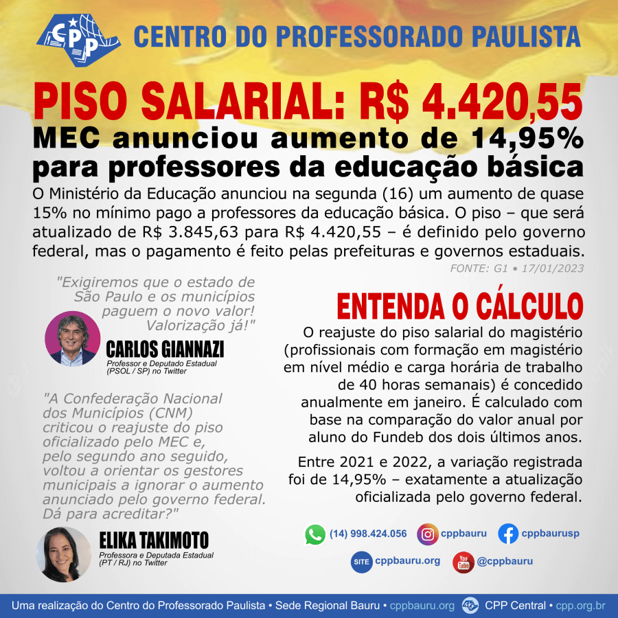O Ministério da Educação anunciou na segunda (16) um aumento de quase 15% no mínimo pago a professores da educação básica. O piso – que será atualizado de R$ 3.845,63 para R$ 4.420,55 – é definido pelo governo federal, mas o pagamento é feito pelas prefeituras e governos estaduais ☺ FONTE: G1 • 17/01/2023