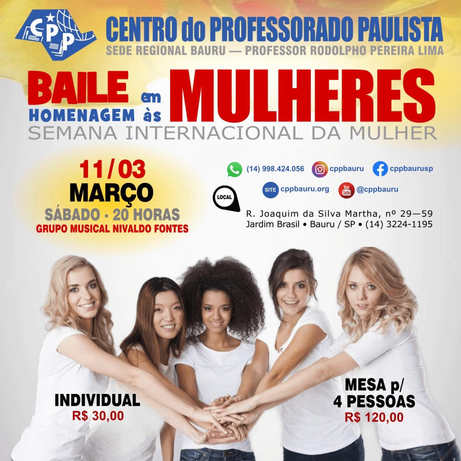 🔔 Acontecerá hoje, sábado 11 de março, o ‘Baile em Homenagem às Mulheres’ no Centro do Professorado Paulista de Bauru 🌐 O evento encerra o ciclo de celebrações da Semana Internacional da Mulher do CPP na cidade 🎵 O som será do Grupo Musical Nivaldo Fontes 💳 O valor do ingresso individual é R$ 30,00 e a mesa p/ 4 pessoas R$120,00 🏡 O CPP Bauru fica na Rua Joaquim da Silva Martha nº 29-59, Jardim Brasil, 17011-170 📞 (14) 3224-1195 🟢 Whatsapp (14) 998.424.056