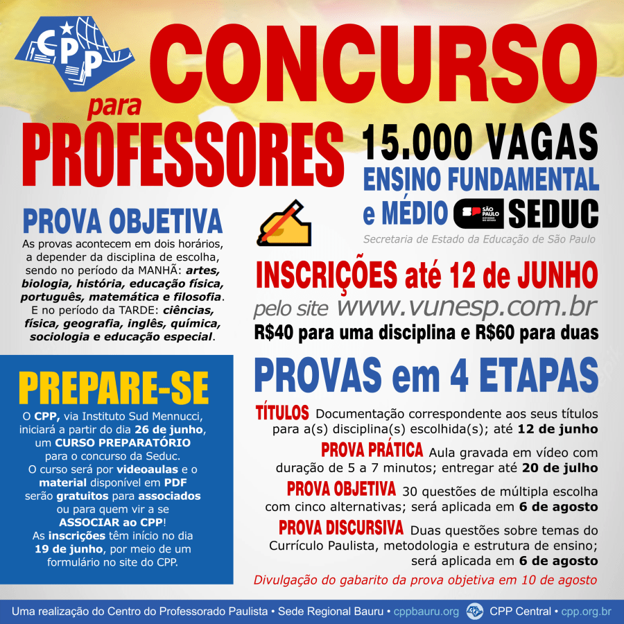 O Estado de São Paulo contratará 15 mil professores e o CPP disponibilizou, grátis para associados, um ‘Curso Preparatório’ para o concurso da Seduc. Veja o edital para as vagas de professores dos ensinos fundamental e médio efetivos e informações e datas sobre o Curso preparatório e também para o concurso público que está com inscrições abertas até 12 junho, no site da Vunesp.
