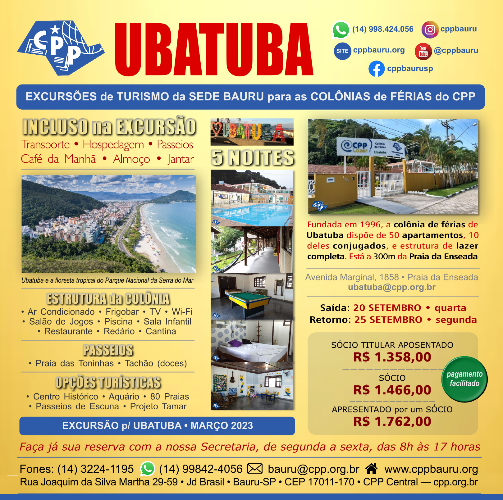 Excursão de 5 Noites, de 20 a 25 de setembro, na Colônia de férias do CPP em Ubatuba. Incluso na excursão: transporte, hospedagem, café da manhã, almoço, jantar e passeios. Confira todas as informações, como horários de ida e volta, preços e detalhes sobre Ubatuba. Entre em contato com a secretaria do CPP Bauru e faça sua reserva. Desfrute com o Turismo do CPP.