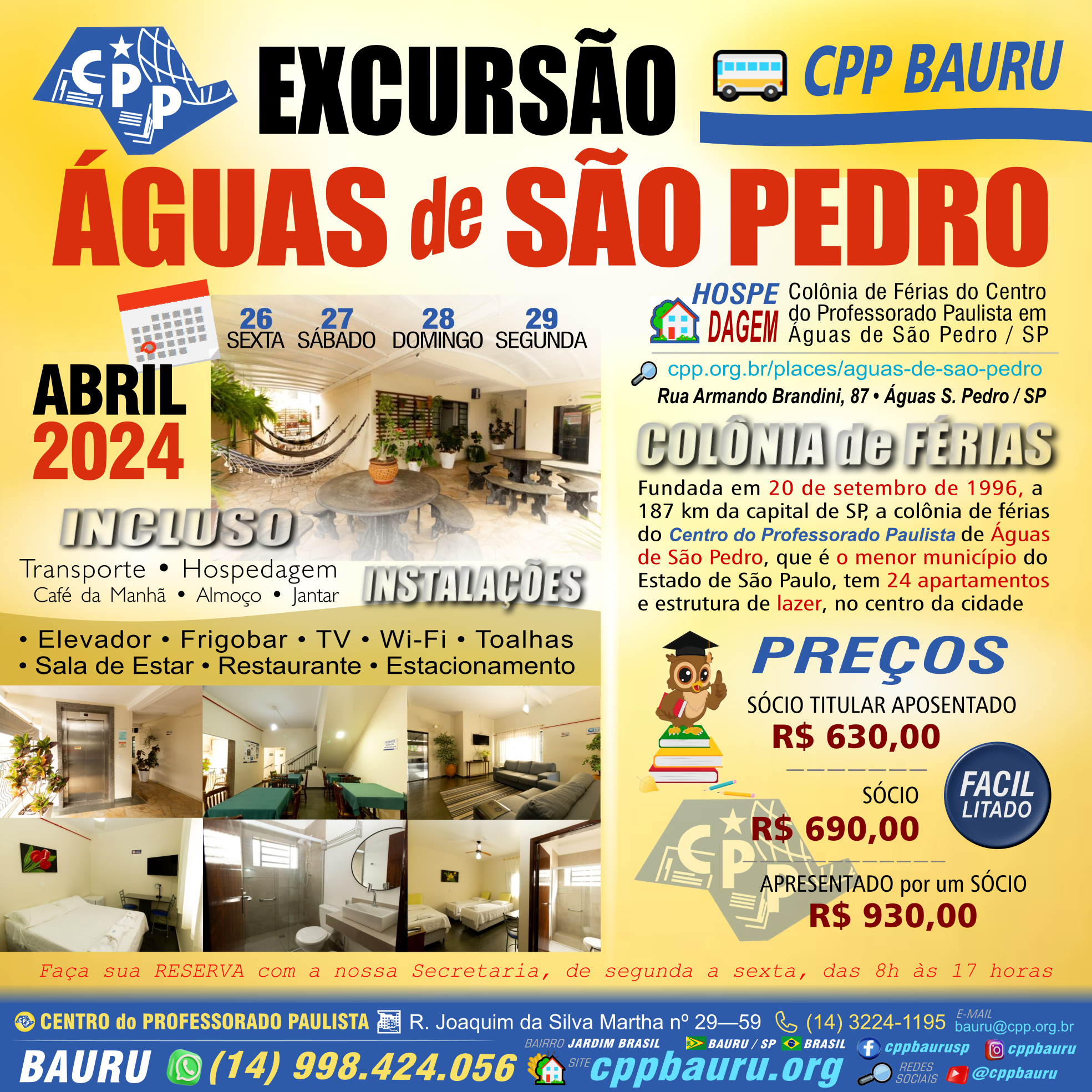 🕗 Saída do CPP Bauru no dia 26 e retorno em 29 de abril 🏡 Hospedagem na colônia de férias de Águas de São Pedro, que possui 24 apartamentos, elevador, frigobar, TV, Wi-Fi, restaurante e estacionamento próprio 📊 INCLUSO na EXCURSÃO: 🚌 transporte 💳 diárias 🍽️ café da manhã, almoço e jantar ☑️ Reservas com a secretaria do clube, de segunda a sexta, das 8h às 17 horas, pelo whatsapp 🟢 (14) 998.424.056