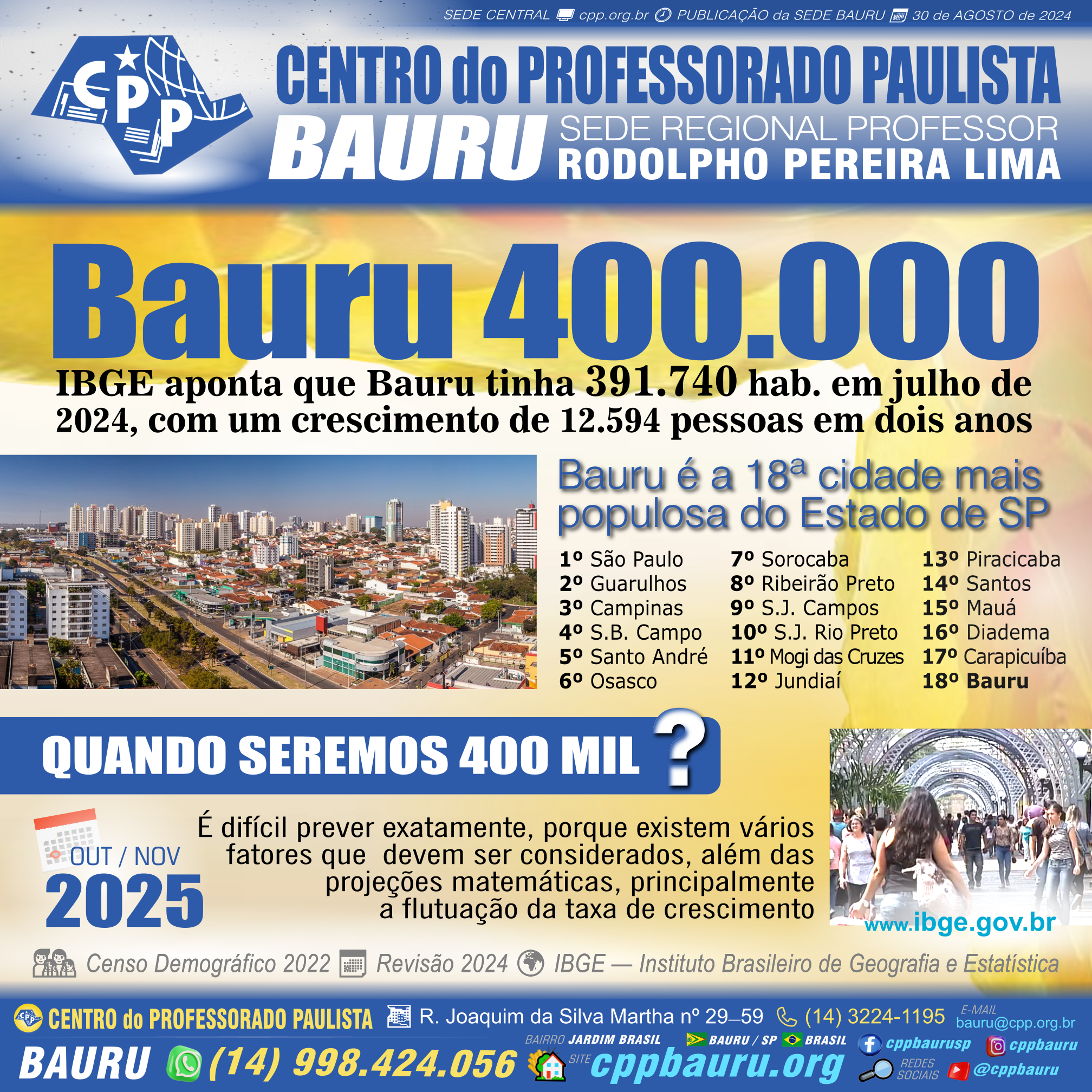 🌍 IBGE aponta que Bauru tinha 391.740 habitantes em julho de 2024, com um crescimento de 12.594 pessoas em dois anos 🎯 Deveremos atingir a marca de 400 mil habitantes na cidade, provavelmente em outubro ou novembro de 2025 🔎 Dados calculados a partir das Projeções da População do Brasil e Unidades da Federação, em 1.º de julho de 2024 👨👧👧 Censo Demográfico 2022 e Revisão 2024 🌍 Instituto Brasileiro de Geografia e Estatística ▶️ www.ibge.gov.br
