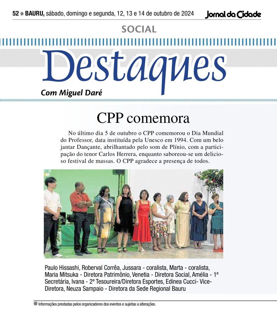 🗺️ Jornal da Cidade 🔎 O CPP Bauru comemorou no último dia 5 de outubro, o Dia Mundial do Professor, data instituída pela Unesco em 1994, com um belo jantar dançante, abrilhantado pelo som de Plínio, e pela participação do tenor Carlos Herrera, enquanto saboreou-se um delicioso festival de massas. Foto com a diretoria e professores.