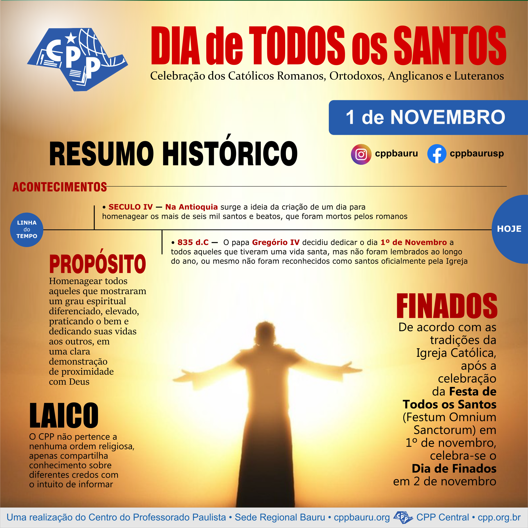 Assim, o dia 1 de novembro serve para homenagear esses santos. Santos são pessoas que praticaram o bem, que dedicaram a sua vida pelos outros e, por isso, a Igreja acredita que estejam junto de Deus.