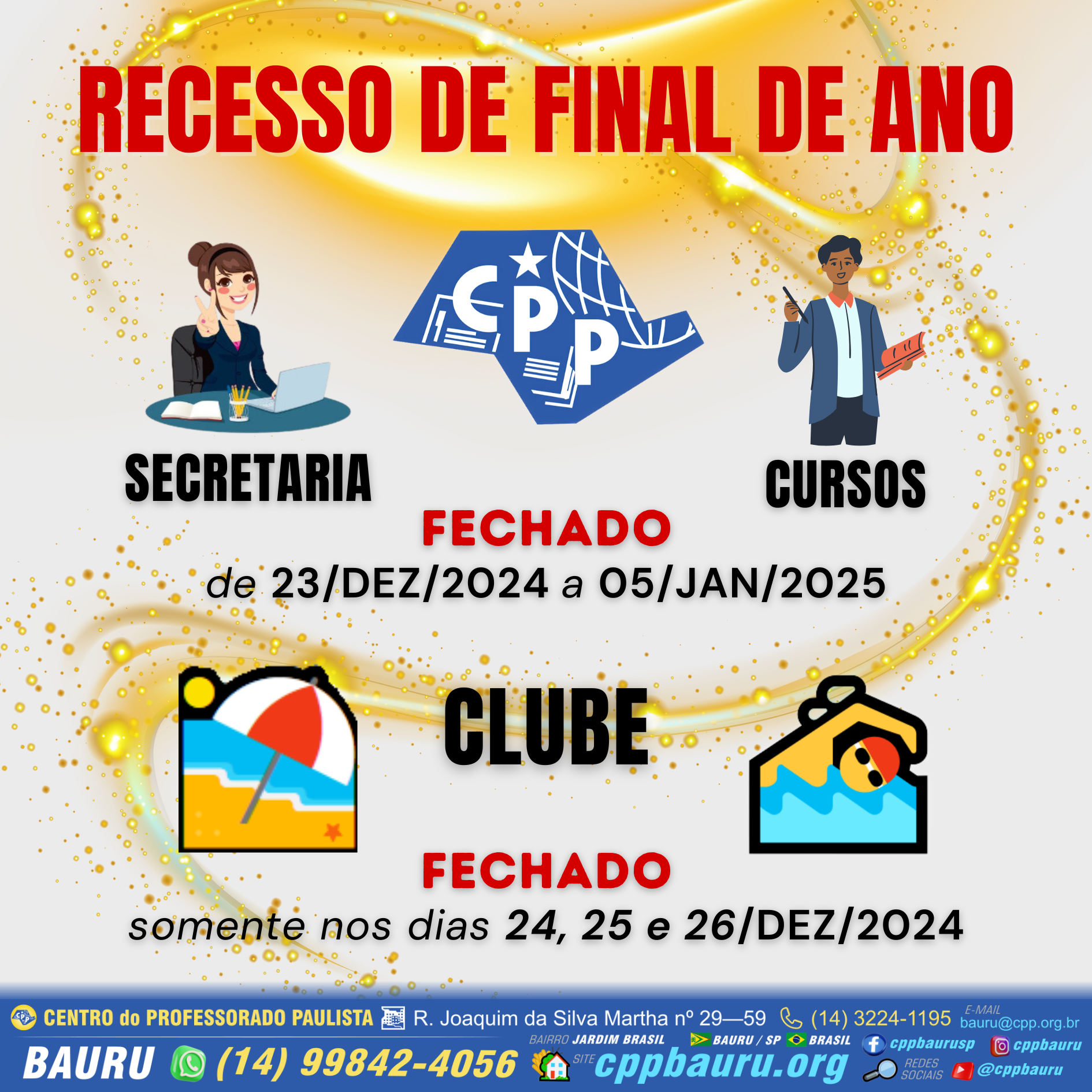 A secretaria e os cursos do Centro do Professorado Paulista de Bauru estarão em recesso de 23 de dezembro a 5 de janeiro de 2025. Já o clube, estará fechado apenas nos dias 24, 25 e 26 de dezembro, para o Natal.