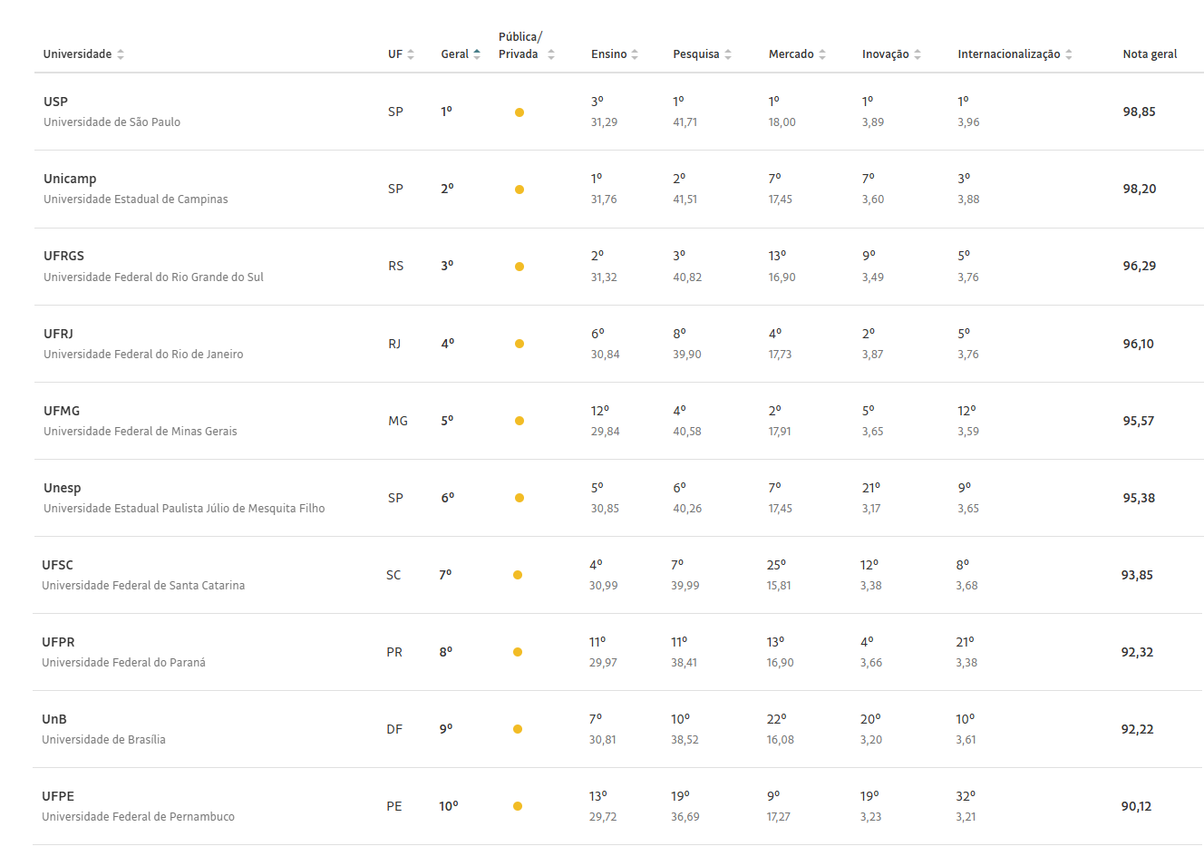 Confira o RUF 2023 da Folha de São Paulo, com as 10 melhores universidades do Brasil. O ranking incluiu universidades privadas, contudo as dez melhores colocadas são todas universidades públicas.