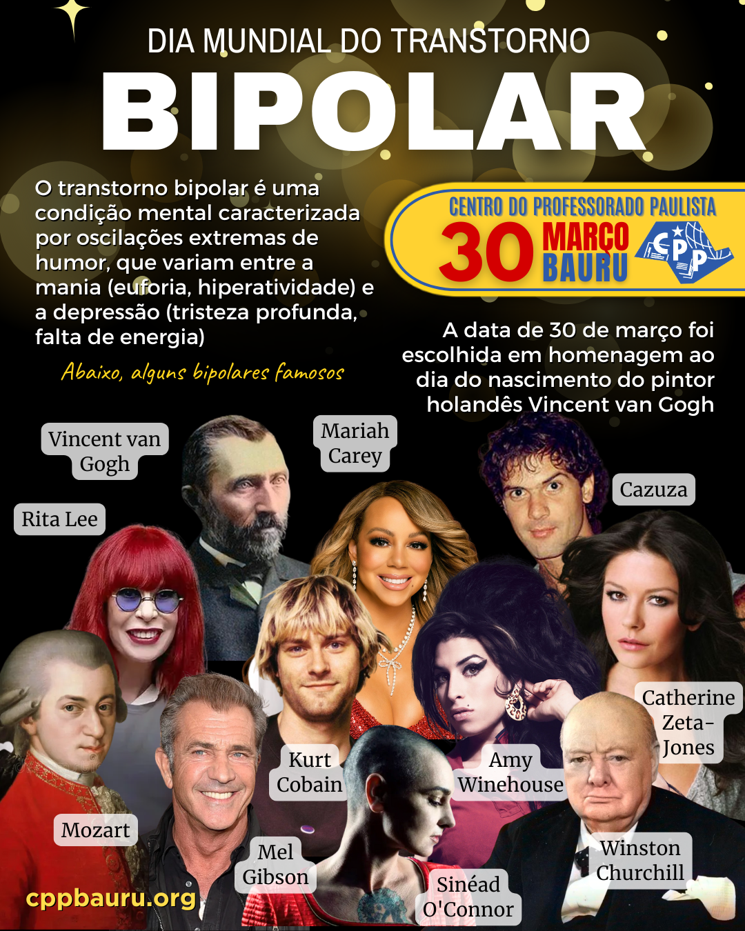 Efeméride dedicada à conscientização sobre essa condição de saúde mental que afeta milhões de pessoas em todo o mundo. A data de 30 de março foi escolhida em homenagem ao dia do nascimento do pintor holandês Vincent Van Gogh, que se acredita ter sofrido de transtorno bipolar.