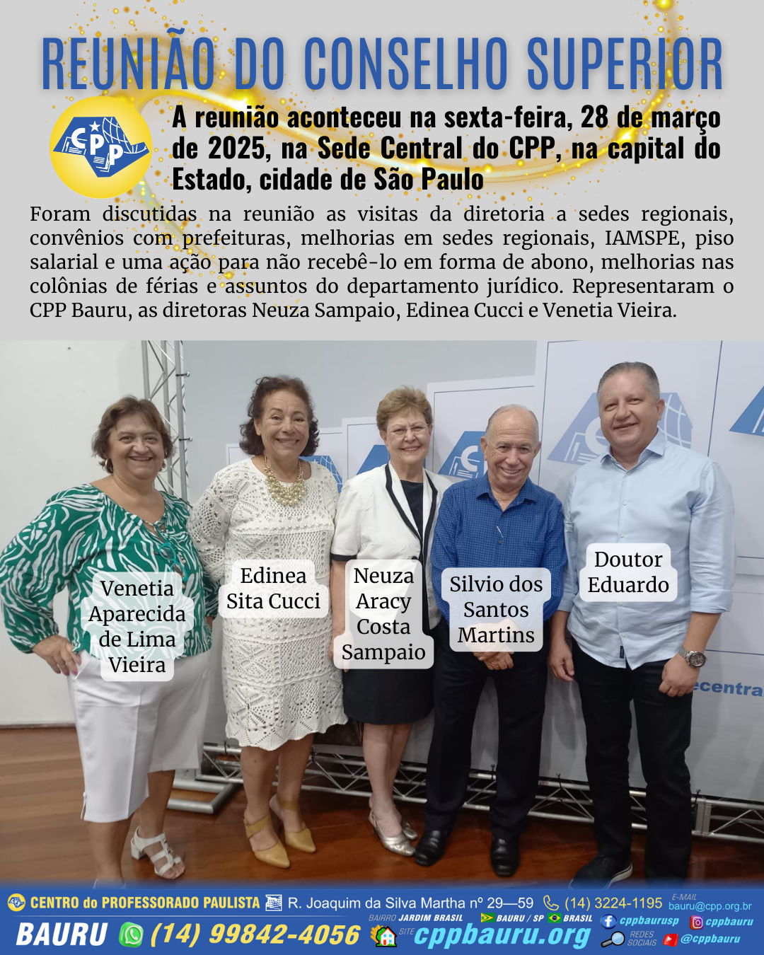 Foram discutidas na reunião as visitas da diretoria a sedes regionais, convênios com prefeituras, melhorias em sedes regionais, IAMSPE, piso salarial e uma ação para não recebê-lo em forma de abono, melhorias nas colônias de férias e assuntos do departamento jurídico. Representaram o CPP Bauru, as diretoras Neuza Sampaio, Edinea Cucci e Venetia Vieira. A reunião do Conselho Superior do CPP aconteceu na sexta-feira, 28 de março de 2025, na Sede Central do Centro do Professorado Paulista.
