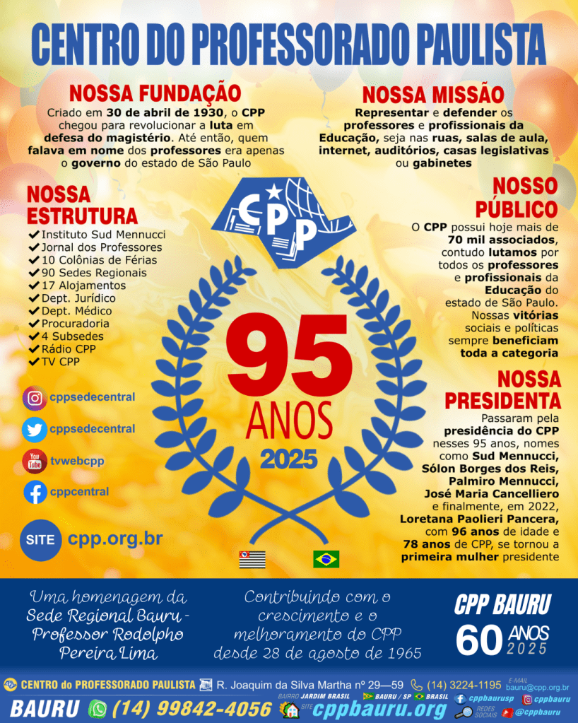 O CPP comemora hoje, 95 anos de história e luta em defesa da Educação. Por um ensino público gratuito de excelência e por professores bem remunerados, qualificados e valorizados. Lutamos pelos professores, mas também pelos demais profissionais da Educação. Representando o magistério, CPP significa: professores unidos pela causa maior.