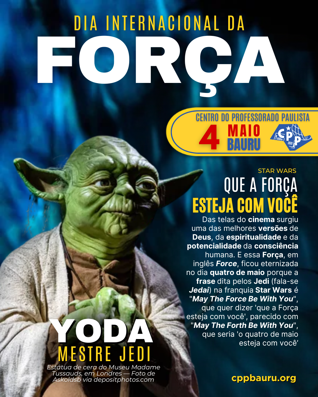 Das telas do cinema surgiu uma das melhores versões de Deus, da espiritualidade e da potencialidade da consciência humana. E essa Força, em inglês Force, ficou eternizada no dia quatro de maio porque a frase dita pelos Jedi (fala-se Jedai) na franquia Star Wars é “May The Force Be With You”, que quer dizer ‘que a Força esteja com você’, parecido com “May The Forth Be With You”, que seria ‘o quatro de maio esteja com você’
