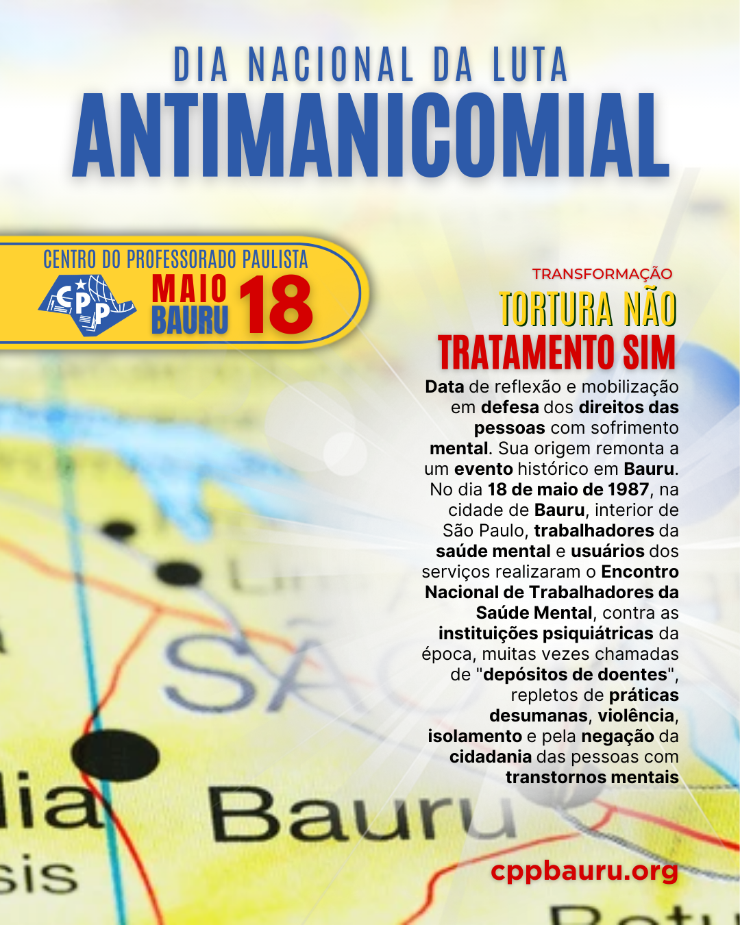 Em 18 de maio de 1987, na cidade de Bauru, interior de São Paulo, trabalhadores da saúde mental e usuários dos serviços realizaram o Encontro Nacional de Trabalhadores da Saúde Mental, contra as instituições psiquiátricas da época, muitas vezes chamadas de “depósitos de doentes”, repletos de práticas desumanas, violência, isolamento e pela negação da cidadania das pessoas com transtornos mentais.
