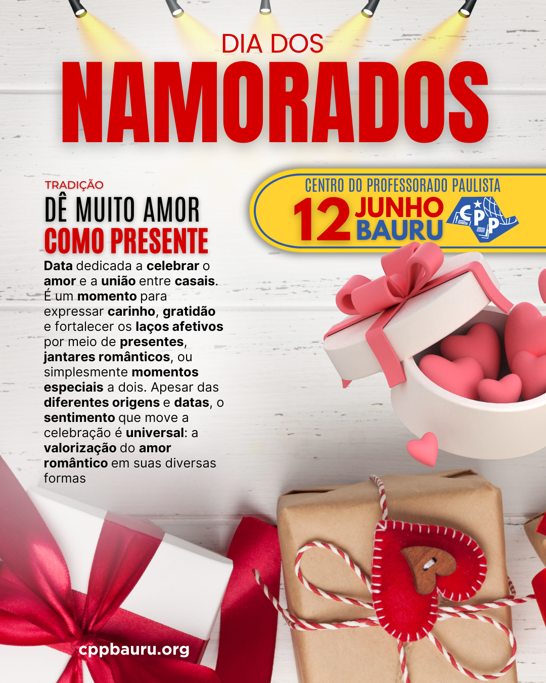 Data dedicada a celebrar o amor e a união entre casais. É um momento para expressar carinho, gratidão e fortalecer os laços afetivos por meio de presentes, jantares românticos, ou simplesmente momentos especiais a dois. Apesar das diferentes origens e datas, o sentimento que move a celebração é universal: a valorização do amor romântico em suas diversas formas.