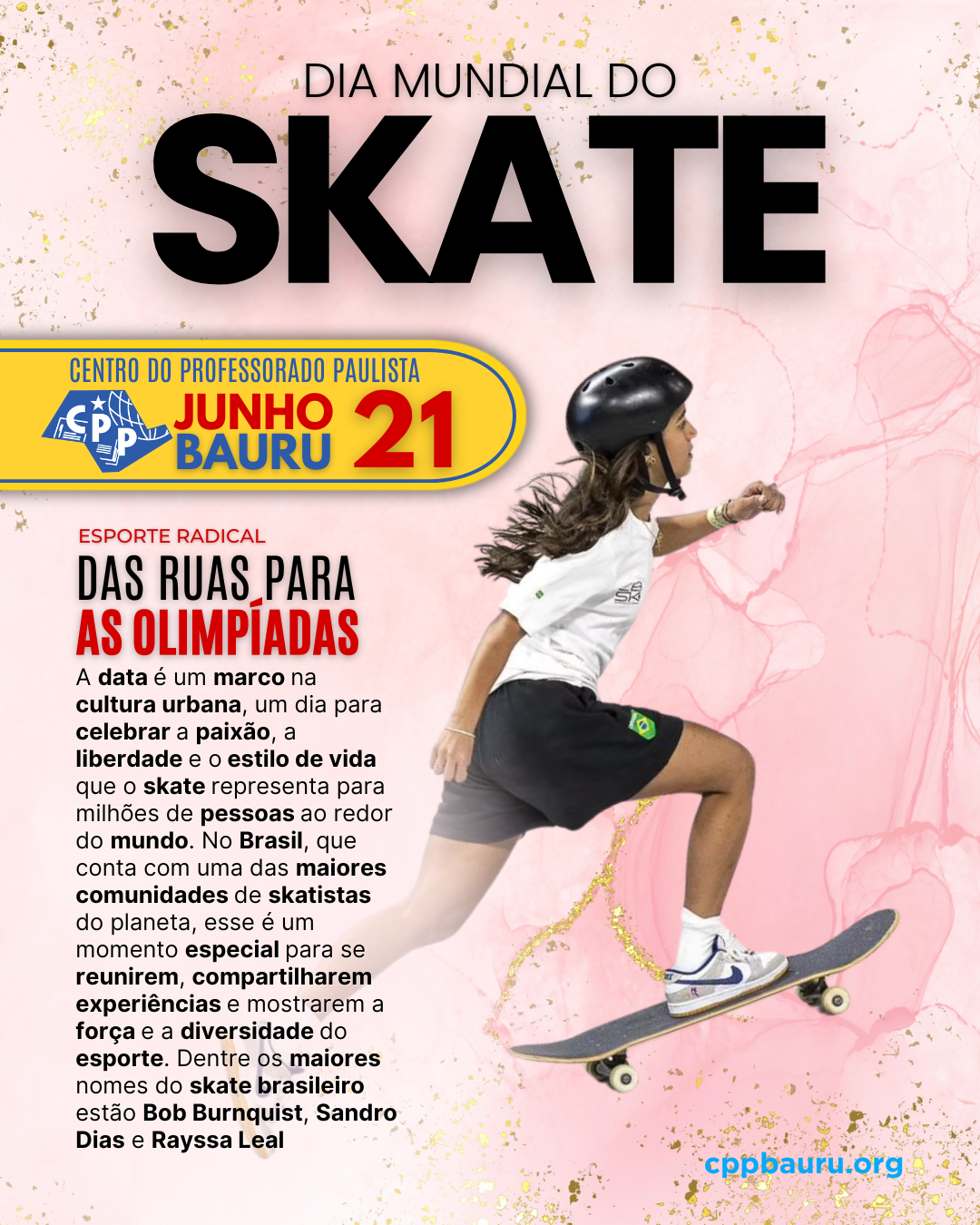 A data é um marco na cultura urbana, um dia para celebrar a paixão, a liberdade e o estilo de vida que o skate representa para milhões de pessoas ao redor do mundo. No Brasil, que conta com uma das maiores comunidades de skatistas do planeta, esse é um momento especial para se reunirem, compartilharem experiências e mostrarem a força e a diversidade do esporte. Dentre os maiores nomes do skate brasileiro estão Bob Burnquist, Sandro Dias e Rayssa Leal.