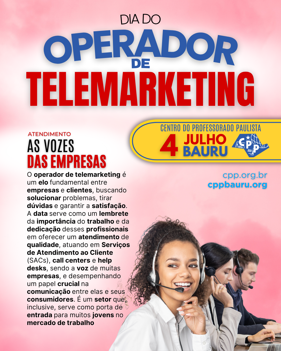 O Dia do Operador de Telemarketing é celebrado em 4 de julho e foi instituído em 2000, através de um projeto de lei do então deputado Nivaldo Santana que reconheceu a importância da profissão e a necessidade de valorizar os operadores de telemarketing, que desempenham um papel fundamental na comunicação entre empresas e clientes.