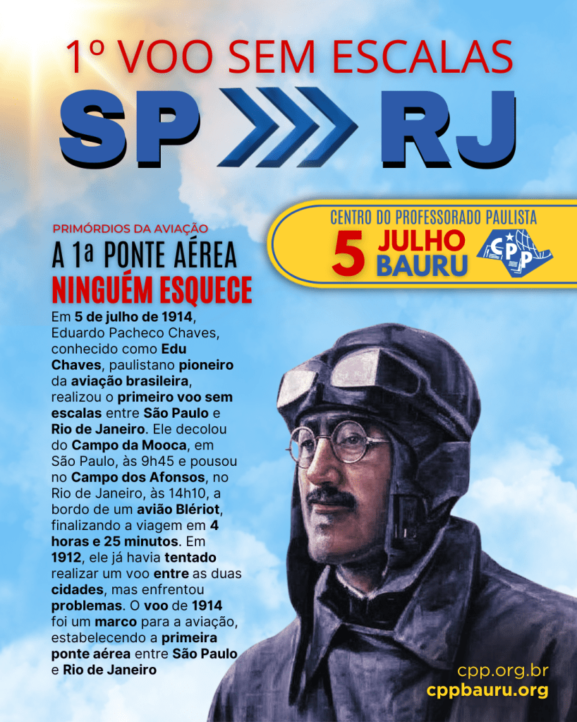 Em 5 de julho de 1914, Eduardo Pacheco Chaves, conhecido como Edu Chaves, paulistano pioneiro da aviação brasileira, realizou o primeiro voo sem escalas entre São Paulo e Rio de Janeiro. Ele decolou do Campo da Mooca, em São Paulo, às 9h45 e pousou no Campo dos Afonsos, no Rio de Janeiro, às 14h10, a bordo de um avião Blériot, finalizando a viagem em 4 horas e 25 minutos.