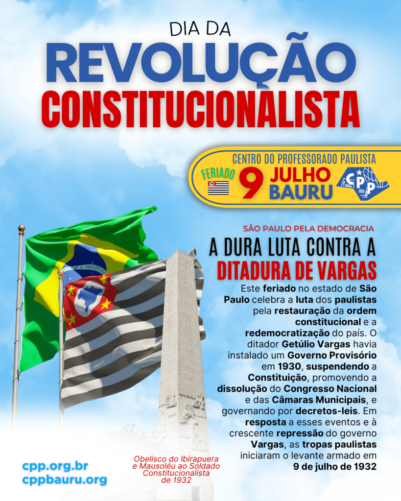 Este feriado no estado de São Paulo celebra a luta dos paulistas pela restauração da ordem constitucional e a redemocratização do país. O ditador Getúlio Vargas havia instalado um Governo Provisório em 1930, suspendendo a Constituição, promovendo a dissolução do Congresso Nacional e das Câmaras Municipais, e governando por decretos-leis. Em resposta a esses eventos e à crescente repressão do governo Vargas, as tropas paulistas iniciaram o levante armado em 9 de julho de 1932.