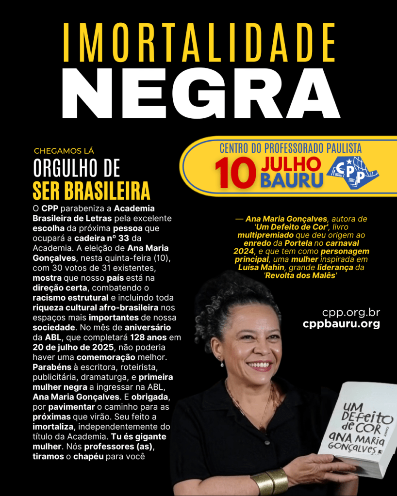 O CPP parabeniza a Academia Brasileira de Letras pela excelente escolha da próxima pessoa que ocupará a cadeira nº 33 da Academia. A eleição de Ana Maria Gonçalves, nesta quinta-feira (10), com 30 votos de 31 existentes, mostra que nosso país está na direção certa, combatendo o racismo estrutural e incluindo toda riqueza cultural afro-brasileira nos espaços mais importantes de nossa sociedade. No mês de aniversário da ABL, que completará 128 anos em 20 de julho de 2025, não poderia haver uma comemoração melhor. Parabéns à escritora, roteirista, publicitária, dramaturga, e primeira mulher negra a ingressar na ABL, Ana Maria Gonçalves. E obrigada, por pavimentar o caminho para as próximas que virão. Seu feito a imortaliza, independentemente do título da Academia. Tu és gigante mulher. Nós professores (as), tiramos o chapéu para você.