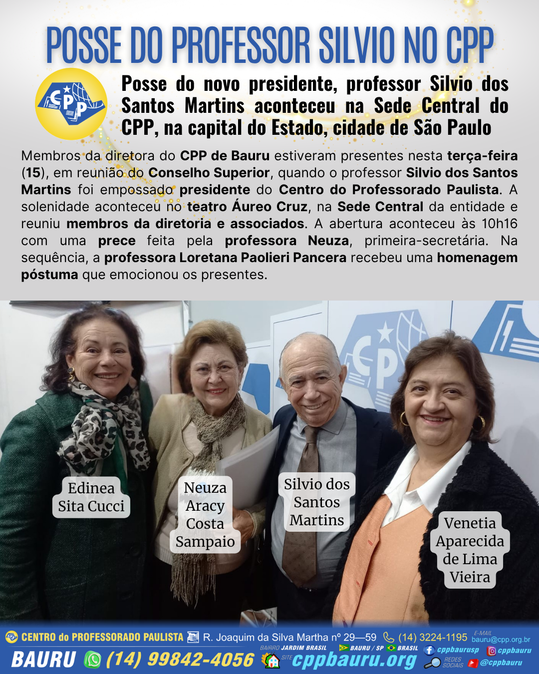 Membros da diretora do CPP de Bauru estiveram presentes nesta terça-feira (15), em reunião do Conselho Superior, quando o professor Silvio dos Santos Martins foi empossado presidente do Centro do Professorado Paulista. A solenidade aconteceu no teatro Áureo Cruz, na Sede Central da entidade e reuniu membros da diretoria e associados. A abertura aconteceu às 10h16 com uma prece feita pela professora Neuza, primeira-secretária. Na sequência, a professora Loretana Paolieri Pancera recebeu uma homenagem póstuma que emocionou os presentes.