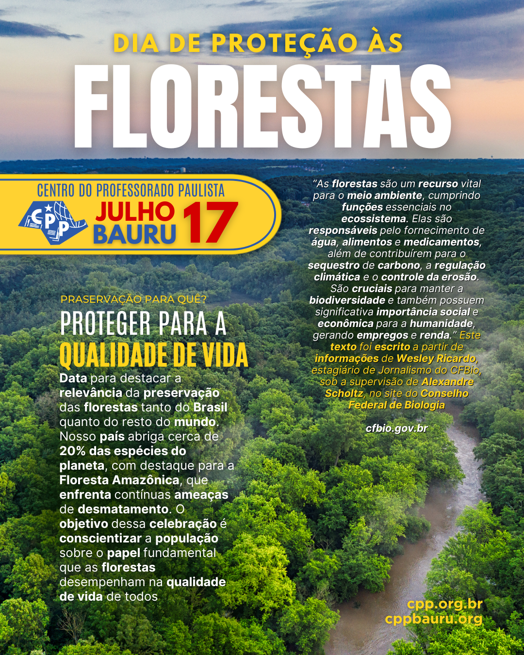 Este texto foi escrito a partir de informações de Wesley Ricardo, estagiário de Jornalismo do CFBio, sob a supervisão de Alexandre Scholtz, no site do Conselho Federal de Biologia ► cfbio.gov.br/2024/07/17/17-de-julho-dia-de-protecao-as-florestas