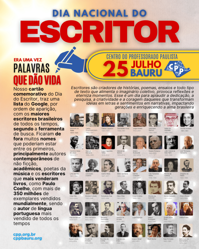 Escritores são criadores de histórias, poemas, ensaios e todo tipo de texto que alimenta o imaginário coletivo, provoca reflexões e eterniza momentos. Esse é um dia para aplaudir a dedicação, a pesquisa, a criatividade e a coragem daqueles que transformam ideias em letras e sentimentos em narrativas, impactando gerações e enriquecendo a alma brasileira.