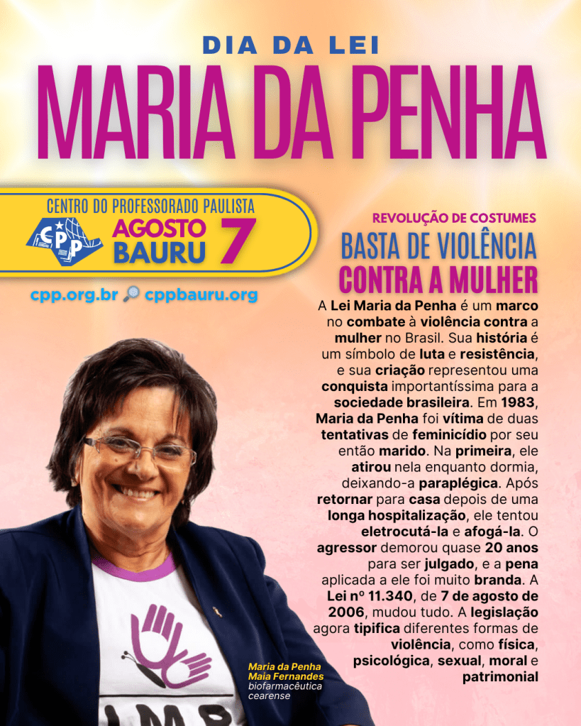 A Lei Maria da Penha é um marco no combate à violência contra a mulher no Brasil. Sua história é um símbolo de luta e resistência, e sua criação representou uma conquista importantíssima para a sociedade brasileira. Em 1983, Maria da Penha foi vítima de duas tentativas de feminicídio por seu então marido. Na primeira, ele atirou nela enquanto dormia, deixando-a paraplégica. Após retornar para casa depois de uma longa hospitalização, ele tentou eletrocutá-la e afogá-la. O agressor demorou quase 20 anos para ser julgado, e a pena aplicada a ele foi muito branda.
