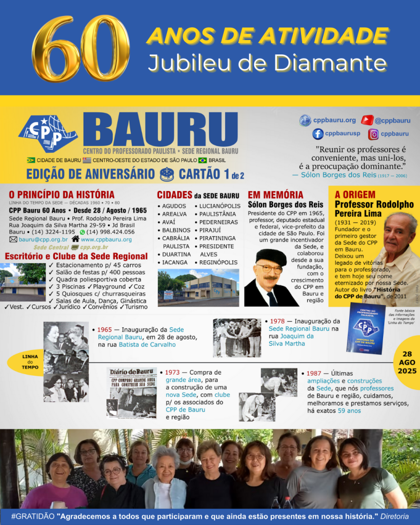 Conheça um pouco da história da Sede Regional Bauru do Centro do Professorado Paulista em dois cartões especiais. A linha do tempo desde sua fundação em 1965, até os dias de hoje, com todas as mudanças e melhoramentos feitos na Sede. Conheça a diretoria, o clube, os cursos, a defesa dos direitos dos professores em várias frentes diferentes, e os serviços da Regional. Associe-se ao CPP Bauru.