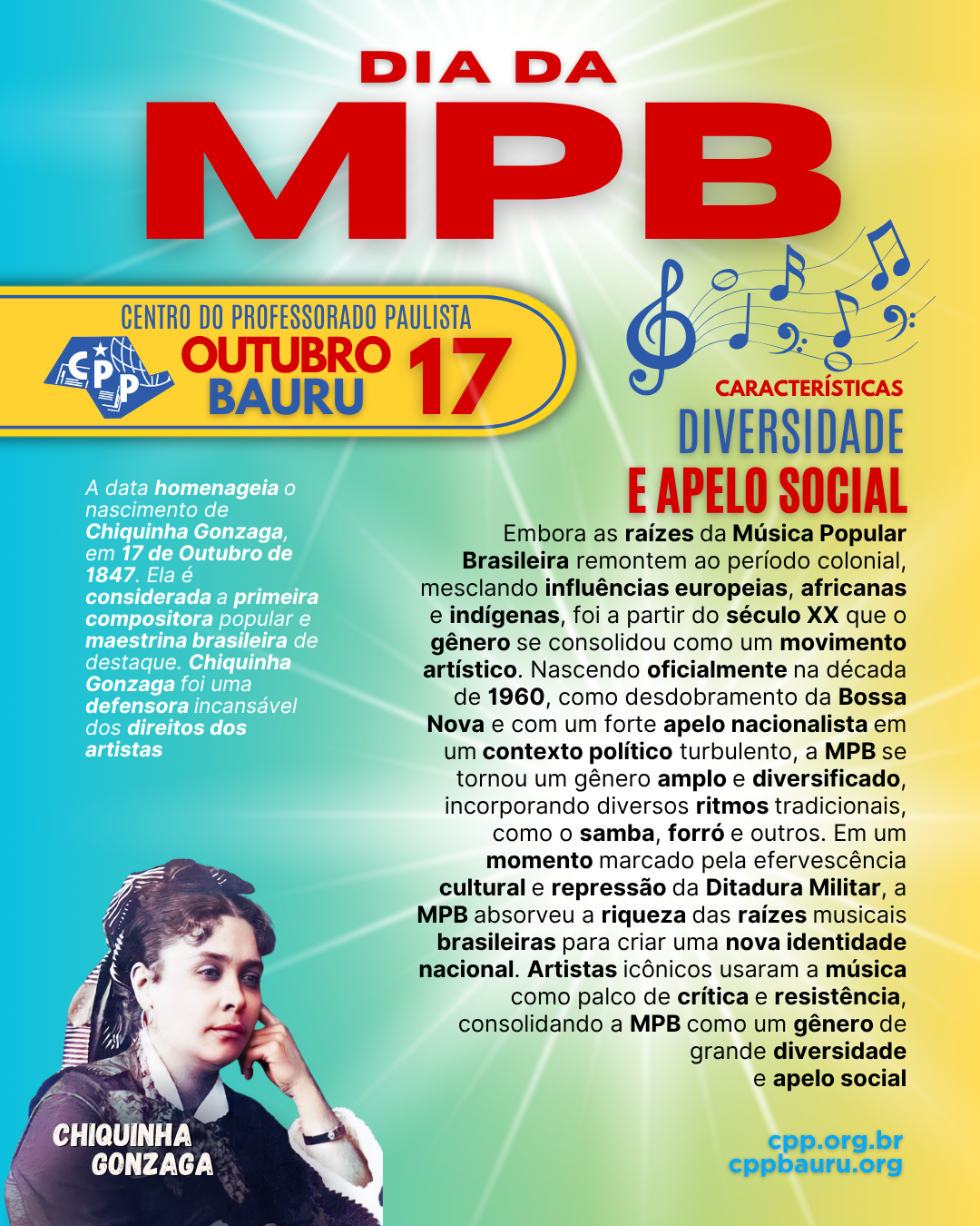 A data homenageia o nascimento de Chiquinha Gonzaga, em 17 de Outubro de 1847, no Rio de Janeiro. Ela é considerada a primeira compositora popular e maestrina brasileira de destaque. Chiquinha Gonzaga foi uma defensora incansável dos direitos dos artistas. Seu empenho culminou na fundação da Sociedade Brasileira de Autores Teatrais (SBAT) em 1917, uma das mais antigas e relevantes entidades de defesa de direitos autorais no país. A atuação de Chiquinha transcendeu a composição, pavimentando o caminho para futuras gerações da MPB.