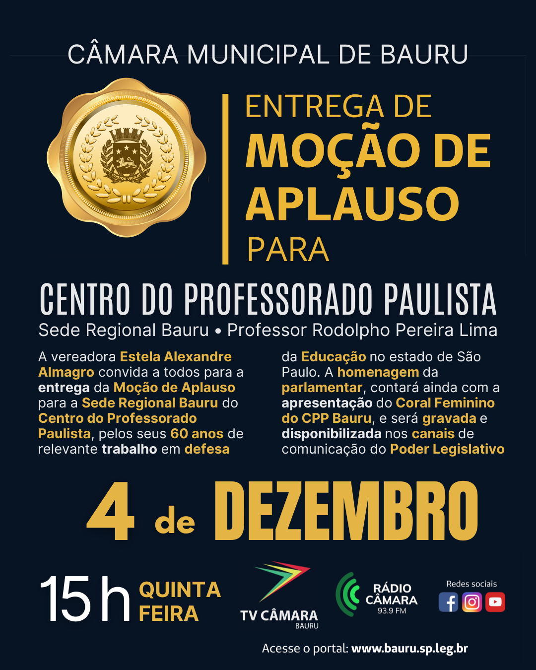 A vereadora Estela Alexandre Almagro convida a todos para a entrega da Moção de Aplauso para a Sede Regional Bauru do Centro do Professorado Paulista, pelos seus 60 anos de relevante trabalho em defesa da Educação no Estado de São Paulo.