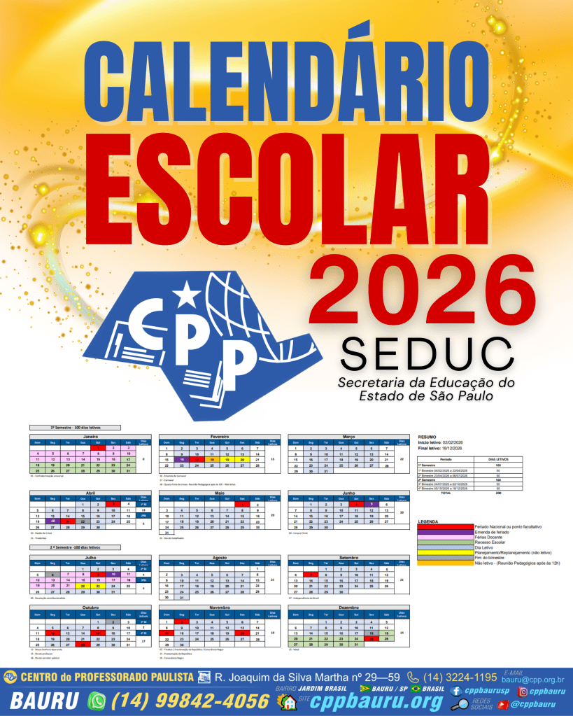 O calendário para o ano letivo de 2026 exige o cumprimento obrigatório de, no mínimo, 200 dias letivos, com a presença de estudantes e professores em atividades pedagógicas. É permitida a utilização de sábados e a adaptação a eventos locais, desde que qualquer dia perdido seja reposto para garantir a carga horária anual prevista para cada nível de ensino. Abaixo o calendário em tamanho original. No final da postagem, todas as informações da Secretaria de Educação do Estado de São Paulo sobre este ano letivo, na integra.