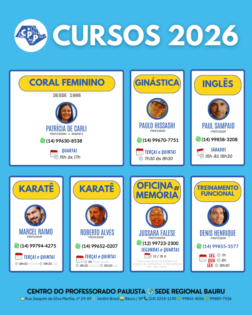 Cursos no Clube do CPP Bauru. Para crianças, adultos e terceira idade. Inscreva-se diretamente com os professores. Para maiores detalhes, consulte nossa secretaria pelo whatsapp (14) 99842-4056 / 99889-7526 — Todas as aulas acontecem no CPP Bauru, que fica na Rua Joaquim da Silva Martha, nº 29-59, Jardim Brasil.