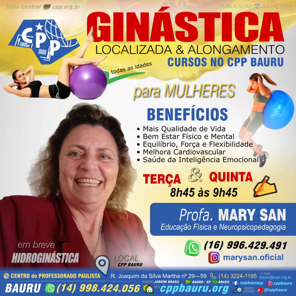 Aulas de ginástica localizada e alongamento ministradas pela Profa. Mary San no CPP Bauru, para mulheres de todas as idades. As aulas são realizadas às terças e quintas-feiras, das 8h45 às 9h45, e oferecem diversos benefícios, como melhora na qualidade de vida, bem-estar físico e mental, equilíbrio, força, flexibilidade, saúde cardiovascular e emocional.